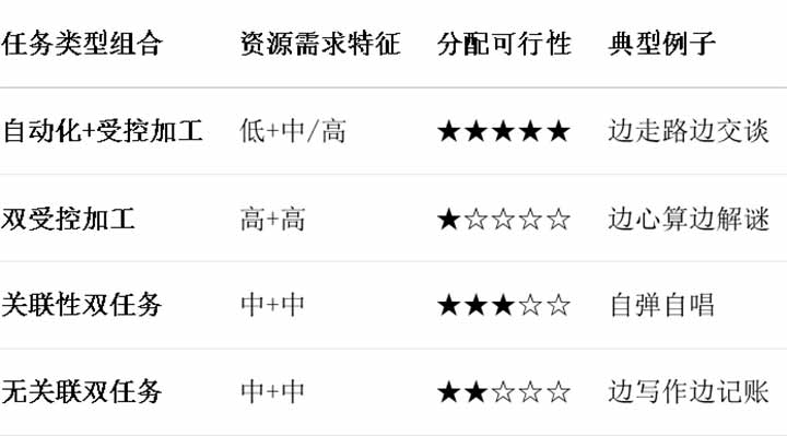 · 任务间的内在关联:当任务形成协同反应系统时,资源消耗显著降低。例如售货员的“唱收唱付”将口头报价与包装动作整合为统一流程,而毫无联系的任务(如边背单词边下棋)则导致资源竞争9。